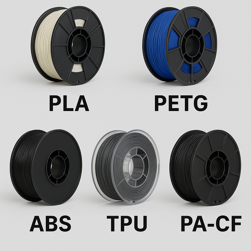 - FDM: PLA, PETG, ABS, TPU, PA-CF (Carbon Fiber Nylon)
